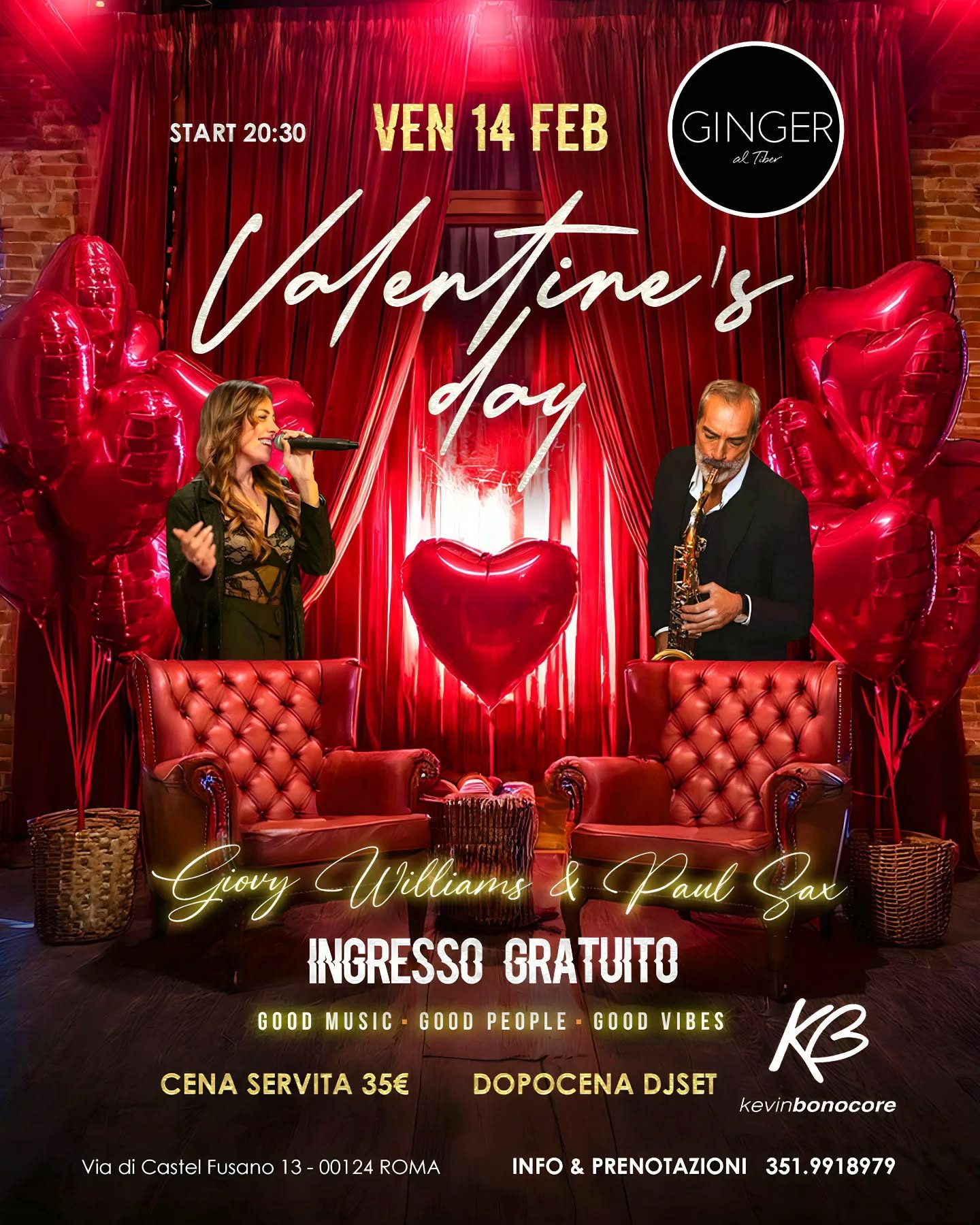 VENERDÌ 14 FEBBRAIO  GINGER al Tiber  SAN VALENTINO  LIVE MUSIC  20:30 Giov…